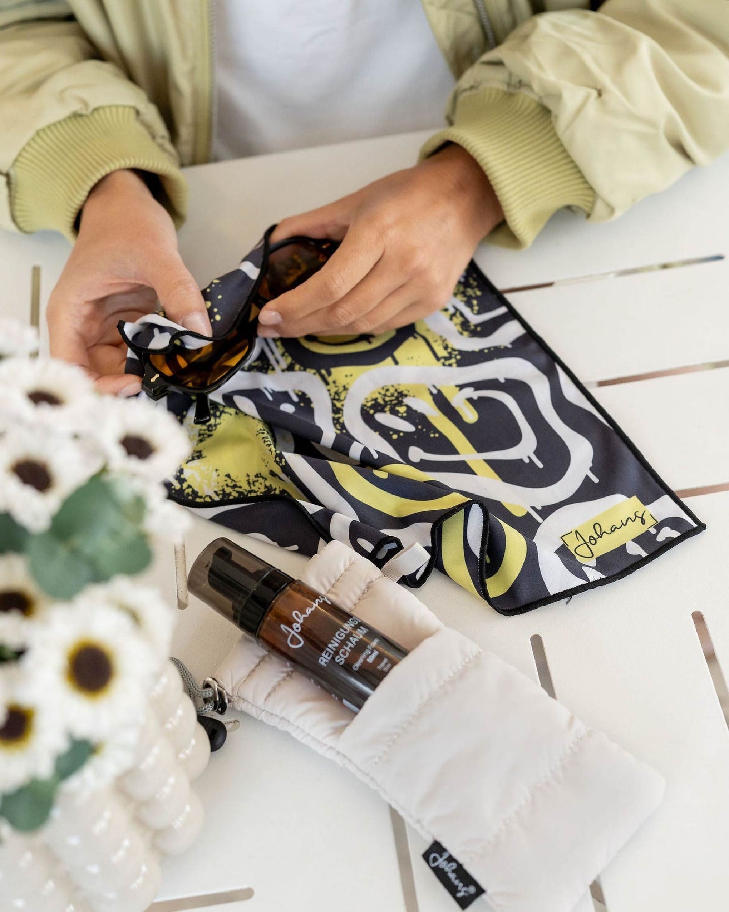 Mit dem Johans Tuch über die Brillengläser kreisen und dabei nur wenig Druck ausüben. Fingerabdrücke und andere fetthaltigen Verschmutzungen verschwinden. Bei hartnäckigem Schmutz: Wiederhole den Vorgang mit einer anderen Stelle des Tuches.